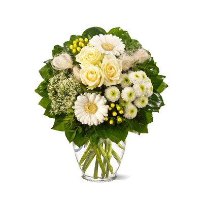 Piękny bukiet mieszanych kwiatów w kolorystyce białej / kremowej. Rozświetli najsmutniejszą twarz i pomoże przekazać Ci same pozytywne i radosne uczucia. Dzięki temu, że nasi floryści wykonają ten bukiet profesjonalnie, masz pewność najlepszej jakości.