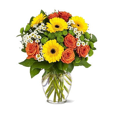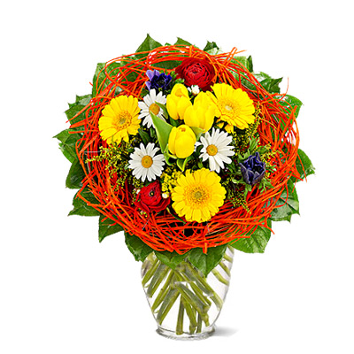Bardzo kolorowy i radosny bukiet kwiatów mieszanych takich jak gerbera, róża, santini i inne. Polecamy na okazje typu: Urodziny, Imieniny, Dzień Matki i inne podobne okazję. Kwiaty z dostawą w całej Polsce.