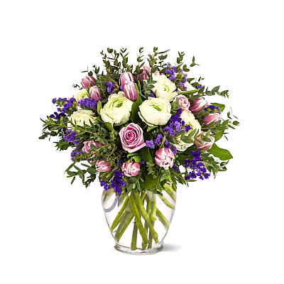 Piękne kwiaty w tonacji biało-różowo-niebieskiej. Idealne na wiele okazji. Róża , irys, tulipan i piękne przybranie. Bukiet odpowiedni zarówno jako prezent dla kobiety i mężczyzny.